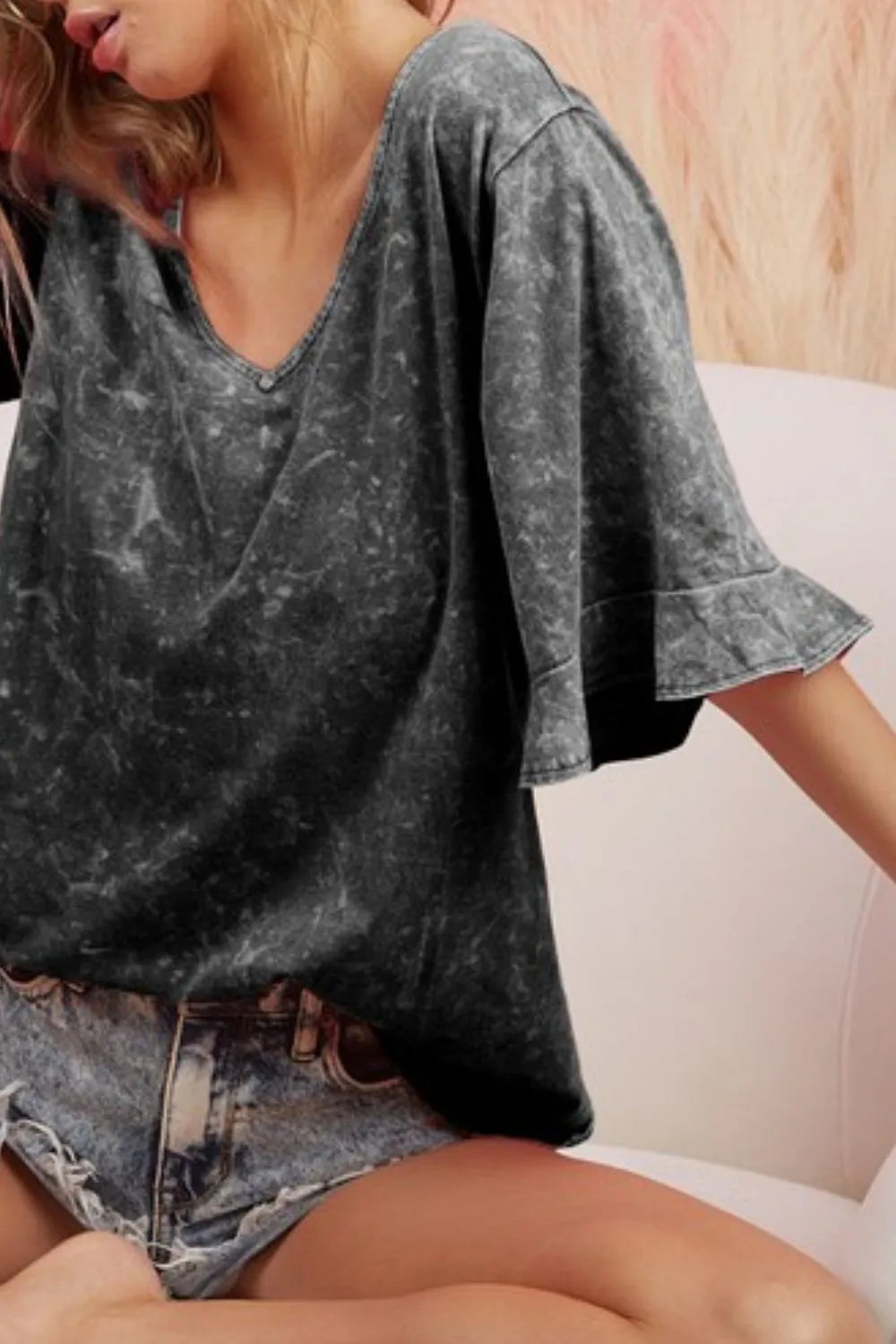 BiBi Mineral Washed V-neck Ruffled Sleeve Top